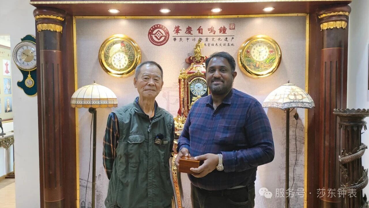 肇庆自鸣钟非遗传承人李宝庆在鼎湖区博物馆赠送利玛窦文创纪念表。
