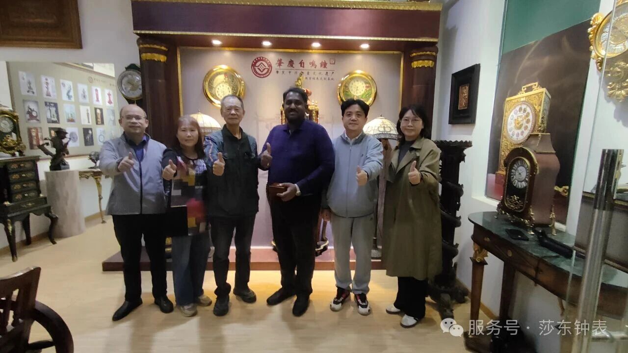 非遗传承人李宝庆.余彩英.鼎湖博物馆肖沛老师与肇庆学院李朝军院长、王灿副院长及印度学者dr joe thomas karackattu ——印度理工大学副教授在利玛窦钟表文创基地合影留念